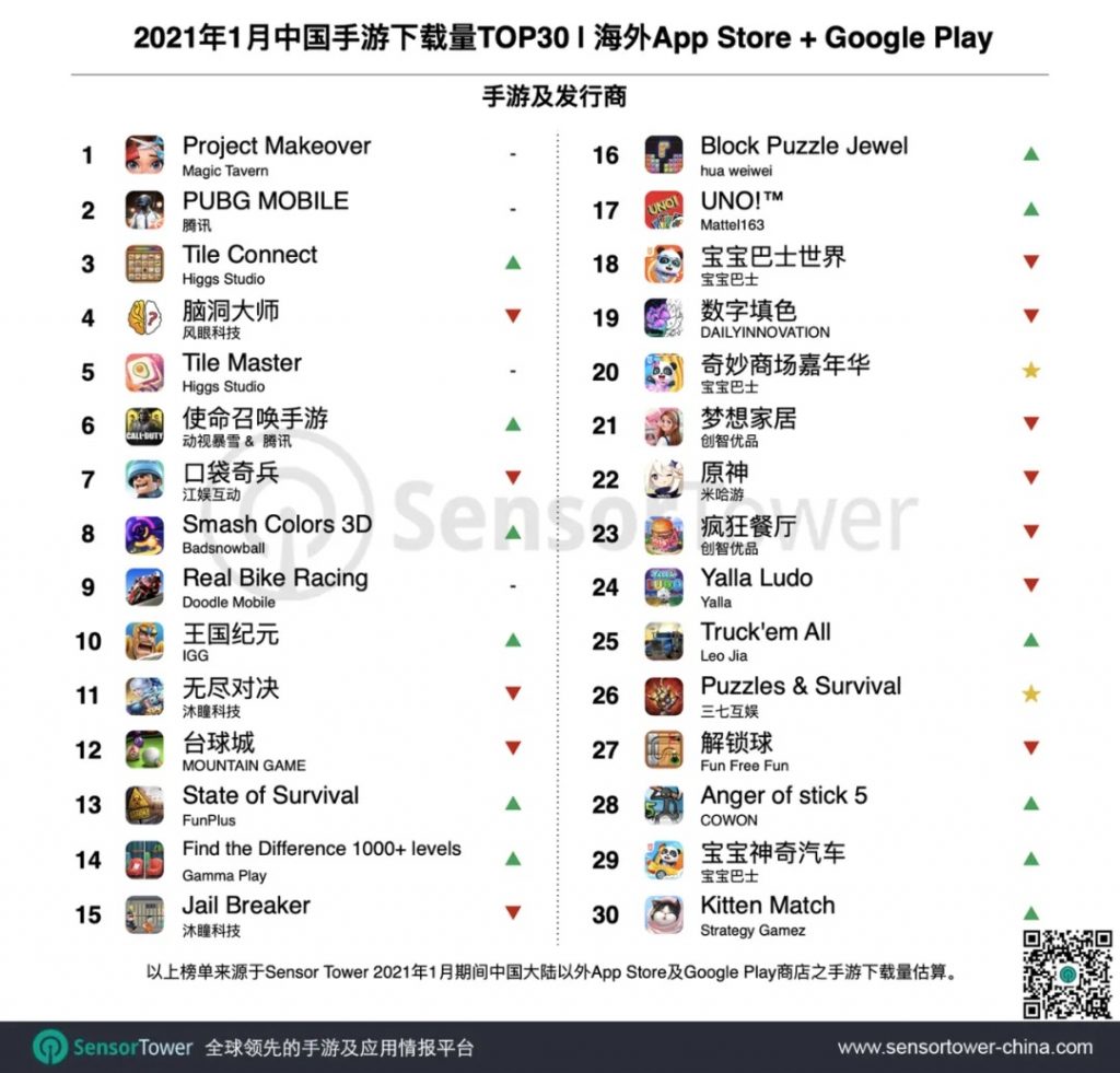 2021 年 1 月中国手游产品在海外商场收入及下载量排名 Top 30